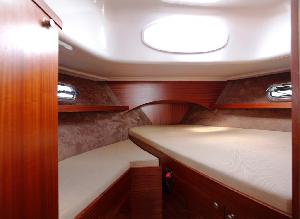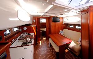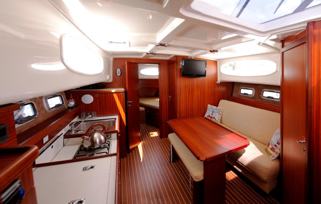 Czego jeszcze można spodziewać się po przedstawionym jachcie? Jest elegancki i gustownie urządzony. W środku klient może znaleźć trzy dwuosobowe kabiny oraz salon, który posiada wygodną kanapę zapewniającą poczucie komfortu. Na jachcie można także znaleźć w pełni wyposażoną kuchnię, w której bez problemu można przygotować i zjeść pyszne posiłki, np. romantyczną kolację dla dwojga czy obiad dla kilkuosobowej rodziny.